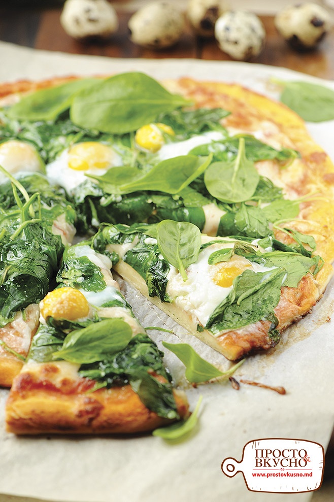 Корж смазать томатным соусом, натереть на него сыр, выложить листья шпината, отправить в духовку, через 5 минут достать и влить на корж перепелиные яйца, посолить и отправить еще на несколько минут в духовку.