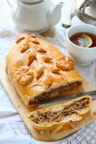 Для начинки капусту нашинковать, луковицу очистить и мелко порезать. Обжарить все вместе на маленьком огне в сковороде до коричневого цвета, посолить.